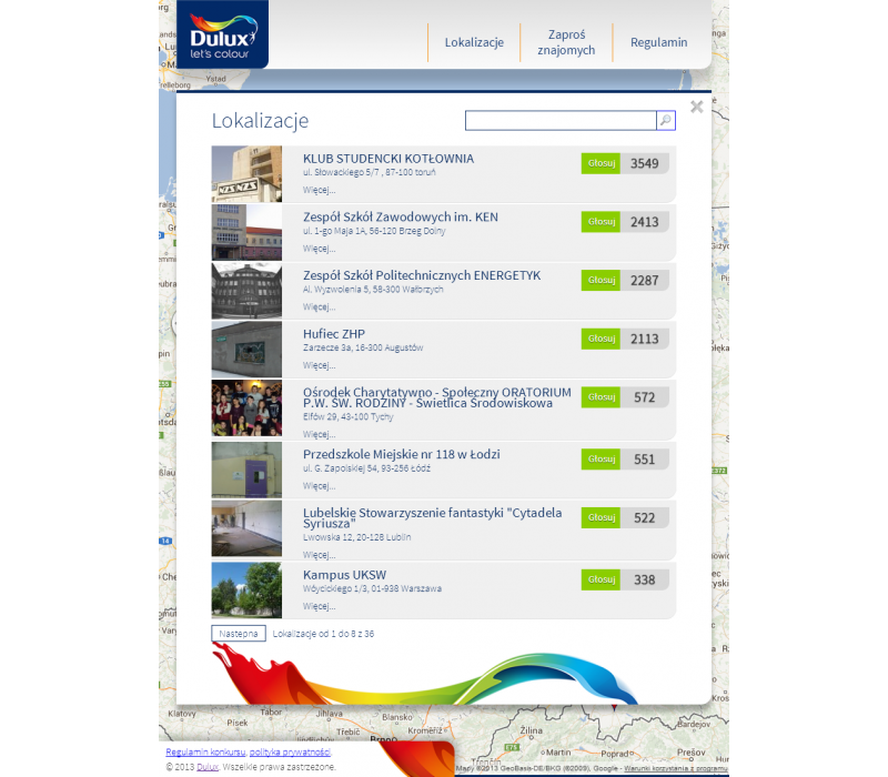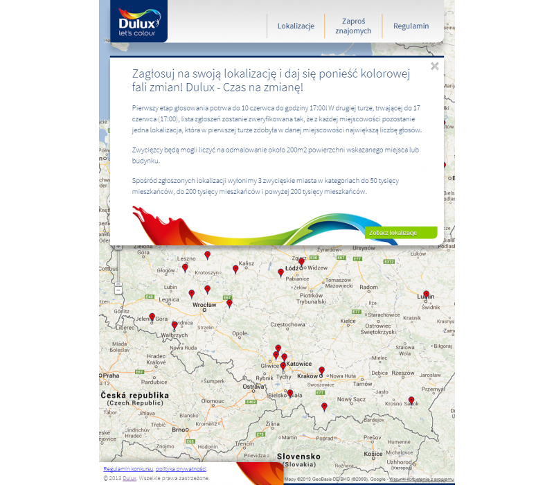We have prepared an application in which objects could be submitted to a vote, and in the next stage users voted for the reported locations. This way Dulux choose in 2013 13 locations to paint.